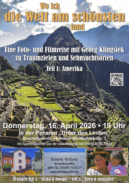 Georg Klingsiek ist mal wieder in Bischofswerda in der Pension "Unter den Linden" und zeigt dort Fotos und Filmaufnahmen aus Nord-, Mittel- und Südamerika.